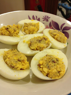 Mixed the egg yolk well with the stuffing , add some mayonnaise and bacon bits(optional) and stuff it where the egg yolk was suppose to be and another yummy bite size snack / appetizer is done. This snack was some sort similar to the one Julien Kang made in WGM if you watch the show :)